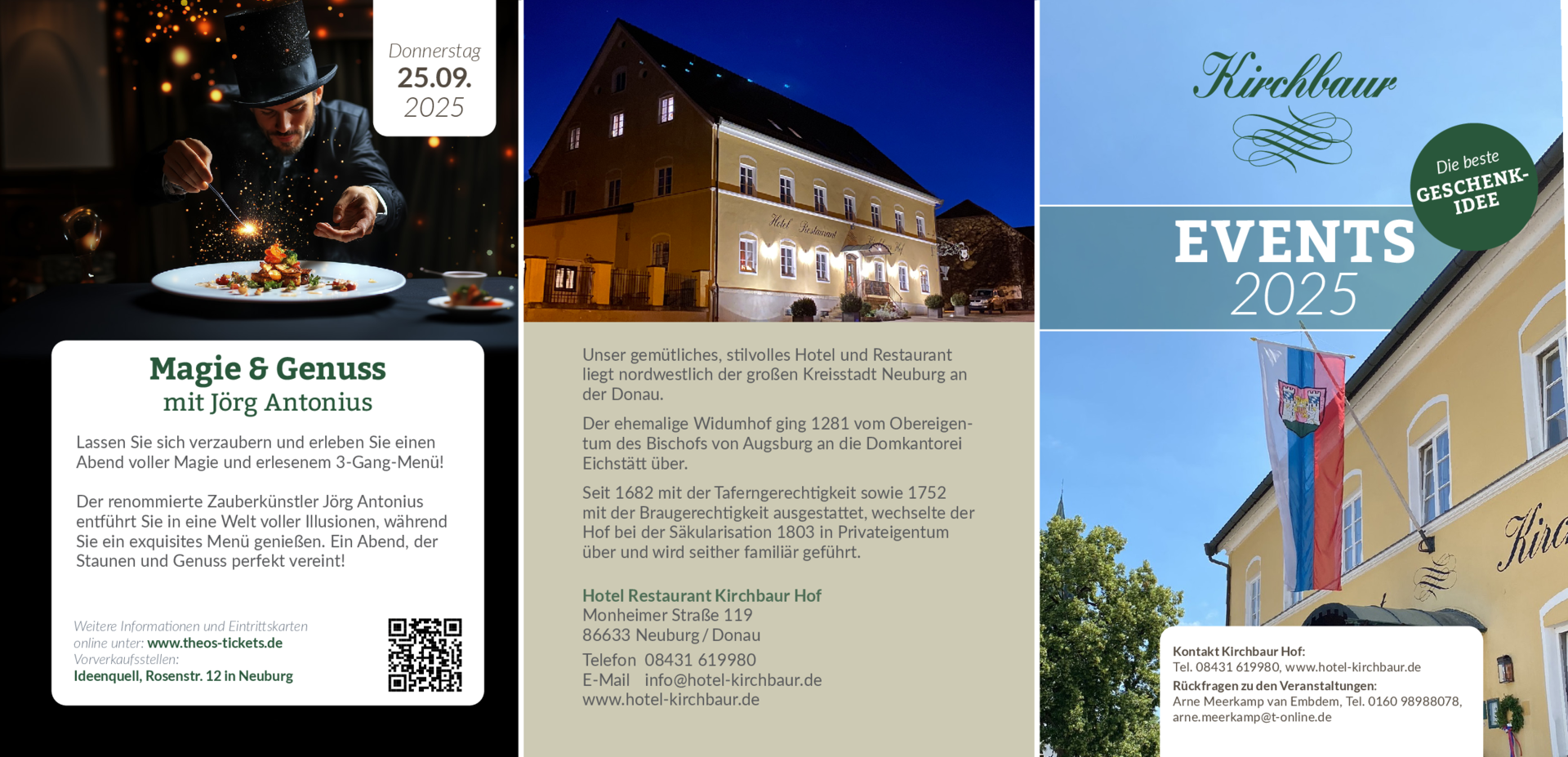 Änderungen an Veranstaltung einreichen NameBeschreibung<h3>Magie und Genuss mit Jörg Antonius</h3> <p>Lassen Sie sich verzaubern und erleben Sie einen Abend voller Magie und erlesenem 3-Gang-Menü.<br /> Der renommierte Zauberkünstler Jörg Antonius entführt Sie in eine Welt voller Illusionen, während Sie ein exquisites Menü genießen.<br /> Ein Abend, der Stauenen und Genuss perfekt vereint!</p> <p>Das Menü:<br /> Scharfe Birnensuppe nach altem Hausrezept mit Chilifäden und Croûtons<br /> ***<br /> Saftige Kalbsnuß aus dem Rohr<br /> dazu Madeirasoße, Marktgemüse und Serviettenknödel<br /> ***<br /> Hausgemachter Kaiserschmarrn<br /> an Rotweinzwetschgen und Vanille-Eis</p> <p>Einlass: 18.30 Uhr<br /> Beginn: 19.00 Uhr<br /> Veranstaltungsort: Hotel Kirchbaur-Hof – Johann Gunzner (Monheimer Str. 119, 86633 Neuburg)<br /> Tickets: 79,00€</p> <p><u><a href="http://www.theos-tickets.de/produkt/magie-genuss/">Hier gibt es Tickets</a></u></p> <p><strong>Unsere Vorverkaufsstellen:</strong><br /> – Stadtmarketing Neuburg (Münchener Str. 15, 86633 Neuburg)<br /> – Acker Hotel (Am Maschinenring 2, 86633 Neuburg)<br /> – Ideenquell Neuburg (Rosenstr. 102, 86633 Neuburg)<br /> Beim Kauf eines Tickets an einer der VVK-Stellen fallen pro Ticket Gebühren in Höhe von 1,00€ zusätzlich zum Ticketpreis an.</p> Bild Sie können hier Dateien ablegen Erlaubte Dateitypen: NameVorschauBeschreibungAlternativtextUrheberrechtLizenzDateigrößeTypZuletzt geändertKategorie2025-05-12_10-20-14-magie----342.89 kBBild18.06.2025, 11:08 - Hinzufügen Dateien Sie können hier Dateien ablegen Erlaubte Dateitypen: NameVorschauBeschreibungAlternativtextUrheberrechtLizenzDateigrößeTypZuletzt geändertKategorie250321_flyerevents-kirchbaurhof_6s_rz.pdf----3.65 MBDokument09.07.2025, 09:58 - Hinzufügen Datum vonDatum bisArne Meerkamp von EmbdenVeranstalter(Bitte auswählen)Hotel & Restaurant Kirchbaur HofVeranstaltungsortKulinarische VeranstaltungSonstigeKategorienIhre AngabenNachnameVornameE-MailTelefonSofern die Veranstaltung abgesagt wird, tragen Sie hier bitte die Gründe dafür ein. Sofern es sich um einen neuen Veranstalter oder Veranstaltungsort handelt, tragen Sie hier bitte die Adresse und Kontaktdaten ein.Bei Absage der Veranstaltung: Grund der Absage. Bei neuem Veranstalter / Ort: Name, E-Mail und/oder Telefon, Webseite, Anschrift.Hiermit bestätige ich, dass ich die Rechte an den von mir hochgeladenen Bildern und Dateien besitze und diese auf der Veranstaltungsplattform und all ihren verknüpften Seiten dargestellt werden dürfen.CaptchaForename Eingaben absenden Abbrechen Informationen zur Verarbeitung Ihrer personenbezogenen Daten finden Sie in der Datenschutzerklärung. * Pflichtfeld Möchten Sie die Änderungen verwerfen?