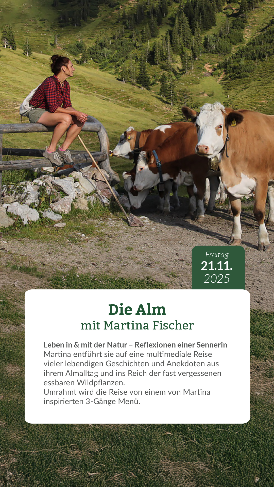 Änderungen an Veranstaltung einreichen NameBeschreibung<p><strong>Die Alm mit Martina Fischer</strong></p> <p>Leben in & mit der Natur – Reflexionen einer Sennerin<br /> Martina entführt Sie auf eine multimediale Reise vieler lebendigen Geschichten und Anekdoten aus ihrem Almalltag und ins Reich der fast vergessenen essbaren Wildpflanzen.<br /> Umrahmt wird die Reise von einem von Martina inspirierten 3-Gänge-Menü.</p> <p>Das Menü:<br /> Gegrillter Ziegenkäse an Feldsalat<br /> ***<br /> Ottheinrich’s Leibspeiße – Rehbraten von den Donau-Auen<br /> dazu hausgemachte Spätzle, Preiselbeerapfel und Blaukraut<br /> ***<br /> „Zickige Nachspeise“</p> <p>Einlass: 18.30 Uhr<br /> Beginn: 19.00 Uhr<br /> Veranstaltungsort: Hotel Kirchbaur-Hof – Johann Gunzner (Monheimer Str. 119, 86633 Neuburg)<br /> Tickets: 79,00€</p> <p><a data-tabindex-counter="1" data-tabindex-value="none" href="http://www.theos-tickets.de/produkt/die-alm/" tabindex="-1"><u>Hier gibts Tickets</u></a></p> <p><strong>Unsere Vorverkaufsstellen:</strong><br /> – Stadtmarketing Neuburg (Münchener Str. 15, 86633 Neuburg)<br /> – Acker Hotel (Am Maschinenring 2, 86633 Neuburg)<br /> – Ideenquell Neuburg (Rosenstr. 102, 86633 Neuburg)<br /> Beim Kauf eines Tickets an einer der VVK-Stellen fallen pro Ticket Gebühren in Höhe von 1,00€ zusätzlich zum Ticketpreis an.</p> Bild Sie können hier Dateien ablegen Erlaubte Dateitypen: NameVorschauBeschreibungAlternativtextUrheberrechtLizenzDateigrößeTypZuletzt geändertKategorie2025-07-07_09-42-30-insta_1080x1920_die-alm_kh----1.28 MBBild09.07.2025, 10:05 - Hinzufügen Dateien Sie können hier Dateien ablegen Erlaubte Dateitypen: Hinzufügen Datum vonDatum bisArne Meerkamp von EmbdenVeranstalter(Bitte auswählen)Hotel & Restaurant Kirchbaur HofVeranstaltungsortKulinarische VeranstaltungKategorienIhre AngabenNachnameVornameE-MailTelefonSofern die Veranstaltung abgesagt wird, tragen Sie hier bitte die Gründe dafür ein. Sofern es sich um einen neuen Veranstalter oder Veranstaltungsort handelt, tragen Sie hier bitte die Adresse und Kontaktdaten ein.Bei Absage der Veranstaltung: Grund der Absage. Bei neuem Veranstalter / Ort: Name, E-Mail und/oder Telefon, Webseite, Anschrift.Hiermit bestätige ich, dass ich die Rechte an den von mir hochgeladenen Bildern und Dateien besitze und diese auf der Veranstaltungsplattform und all ihren verknüpften Seiten dargestellt werden dürfen.CaptchaForename Eingaben absenden Abbrechen Informationen zur Verarbeitung Ihrer personenbezogenen Daten finden Sie in der Datenschutzerklärung. * Pflichtfeld Möchten Sie die Änderungen verwerfen?
