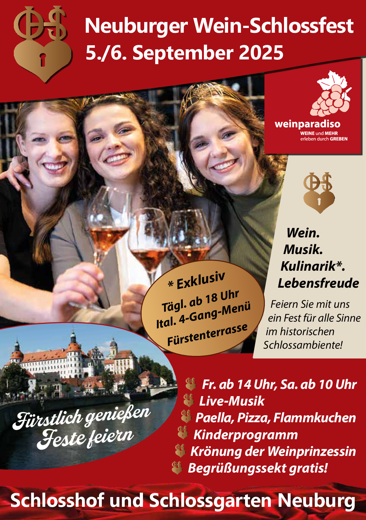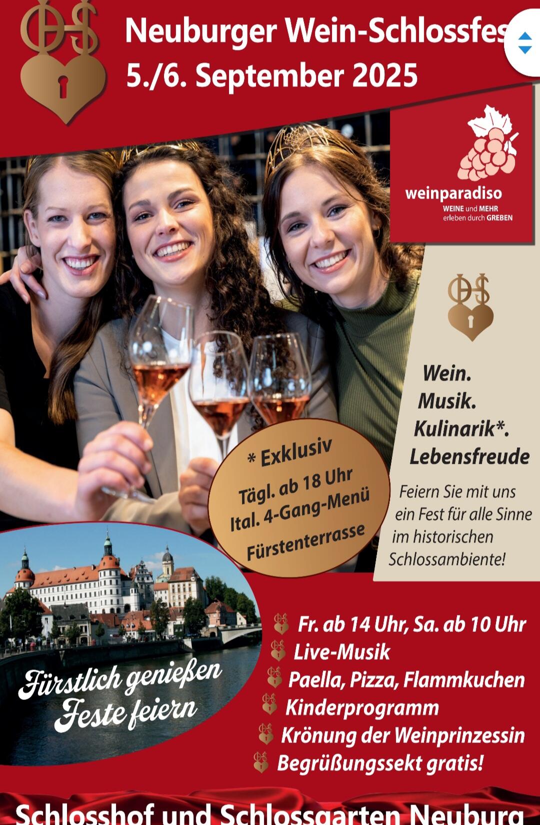 Änderungen an Veranstaltung einreichen NameBeschreibung<p><strong>Neuburger Wein-Schlossfest </strong>am 05. und 06.09.2025 im Schlosshof und im Schlossgarten in Neuburg an der Donau.</p> <p>Wine-Tasting und Live Musik</p> <p>Für Kinder bis 14 Jahre ist der Eintritt frei!</p> <p>Sie erhalten keine separaten Tickets zugesandt, bitte bringen Sie Ihre ausgedruckte Bestellbestätigung zum Einlass mit, diese gilt als Ihr Eintrittsticket!</p> <p><span style="color:#e74c3c">Wir behalten uns vor, das Event abzusagen bzw. zu verlegen, wenn die Wettervorhersage entsprechend schlecht ist.</span></p> <p><strong>TICKETS KÖNNEN HIER GEBUCHT WERDEN:</strong> <a href="https://weinparadiso.de/products/neuburger-wein-schlossfest-am-05-06-09-2025-im-schlosshof-und-schlossgarten-neuburg" tabindex="-1" target="_blank">1. Neuburger Wein-Schlossfest</a></p> Bild Sie können hier Dateien ablegen Erlaubte Dateitypen: NameVorschauBeschreibungAlternativtextUrheberrechtLizenzDateigrößeTypZuletzt geändertKategorie2025-08-14_15-21-35-20250808_103115----504.43 kBBild20.08.2025, 11:48 - Hinzufügen Dateien Sie können hier Dateien ablegen Erlaubte Dateitypen: NameVorschauBeschreibungAlternativtextUrheberrechtLizenzDateigrößeTypZuletzt geändertKategorieprogrammuebersicht_wein-schlossfest.pdf----0.99 MBDokument20.08.2025, 11:46 - Hinzufügen Datum vonDatum bisWeinparadisoVeranstalter(Bitte auswählen)Residenzschloss NeuburgVeranstaltungsortKulinarische VeranstaltungKategorienIhre AngabenNachnameVornameE-MailTelefonSofern die Veranstaltung abgesagt wird, tragen Sie hier bitte die Gründe dafür ein. Sofern es sich um einen neuen Veranstalter oder Veranstaltungsort handelt, tragen Sie hier bitte die Adresse und Kontaktdaten ein.Bei Absage der Veranstaltung: Grund der Absage. Bei neuem Veranstalter / Ort: Name, E-Mail und/oder Telefon, Webseite, Anschrift.Hiermit bestätige ich, dass ich die Rechte an den von mir hochgeladenen Bildern und Dateien besitze und diese auf der Veranstaltungsplattform und all ihren verknüpften Seiten dargestellt werden dürfen.CaptchaForename Eingaben absenden Abbrechen Informationen zur Verarbeitung Ihrer personenbezogenen Daten finden Sie in der Datenschutzerklärung. * Pflichtfeld Möchten Sie die Änderungen verwerfen?