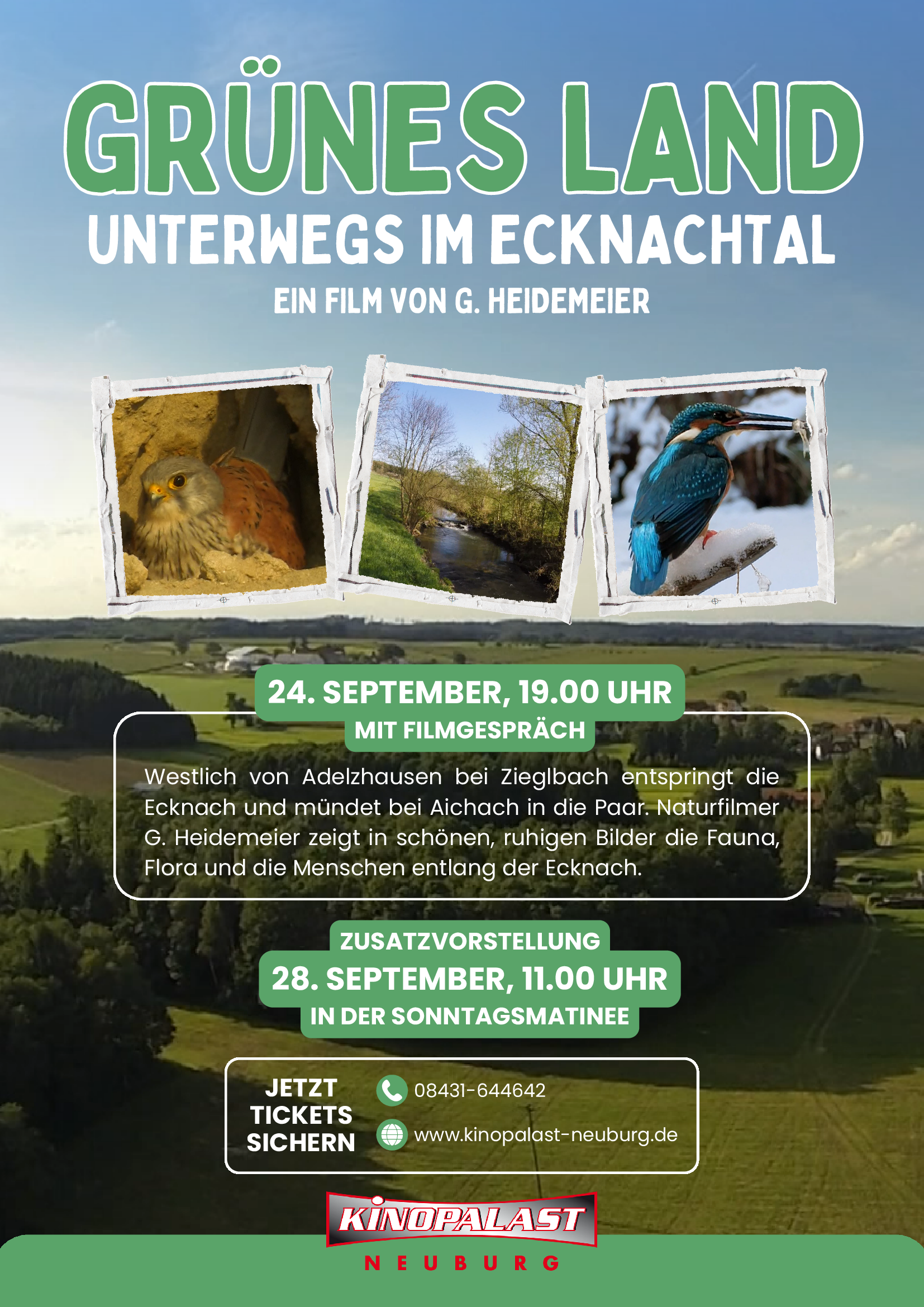 Änderungen an Veranstaltung einreichen NameBeschreibung<p style="text-align:justify">Um <strong>19:00 Uhr</strong> findet im Neuburger Kinopalast die Filmvorführung "Grünes Land" von Naturfilmer Günter Heidemeier statt, welcher zur Vorstellung ebenfalls anwesend sein wird.</p> <p style="text-align:justify">Westlich von Adelzhausen bei Zieglbach entspringt die Ecknach und mündet bei Aichach in die Paar. Naturfilmer G. Heidemeier zeigt in schönen, ruhigen Bilder die Fauna, Flora und die Menschen entlang der Ecknach.</p> <p style="text-align:justify">Jetzt <strong>Tickets</strong> sichern unter <u><a data-tabindex-counter="1" data-tabindex-value="none" href="https://www.kinopalast-neuburg.de/" tabindex="-1">www.kinopalast-neuburg.de</a></u></p> Bild Sie können hier Dateien ablegen Erlaubte Dateitypen: NameVorschauBeschreibungUrheberrechtLizenzDateigrößeTypZuletzt geändertKategoriegruenes_land_kinopalast_filmabend---3.56 MBBild26.08.2025, 15:36 - Hinzufügen Dateien Sie können hier Dateien ablegen Erlaubte Dateitypen: NameVorschauBeschreibungUrheberrechtLizenzDateigrößeTypZuletzt geändertKategoriegruenes-land-heidemeier.pdf---7.22 MBDokument26.08.2025, 15:36 - Hinzufügen Datum vonDatum bisVeranstalter(Bitte auswählen)Kinopalast NeuburgVeranstaltungsortFilm und KinoKategorienIhre AngabenNachnameVornameE-MailTelefonSofern die Veranstaltung abgesagt wird, tragen Sie hier bitte die Gründe dafür ein. Sofern es sich um einen neuen Veranstalter oder Veranstaltungsort handelt, tragen Sie hier bitte die Adresse und Kontaktdaten ein.Bei Absage der Veranstaltung: Grund der Absage. Bei neuem Veranstalter / Ort: Name, E-Mail und/oder Telefon, Webseite, Anschrift.Hiermit bestätige ich, dass ich die Rechte an den von mir hochgeladenen Bildern und Dateien besitze und diese auf der Veranstaltungsplattform und all ihren verknüpften Seiten dargestellt werden dürfen.CaptchaForename Eingaben absenden Abbrechen Informationen zur Verarbeitung Ihrer personenbezogenen Daten finden Sie in der Datenschutzerklärung. * Pflichtfeld Möchten Sie die Änderungen verwerfen?