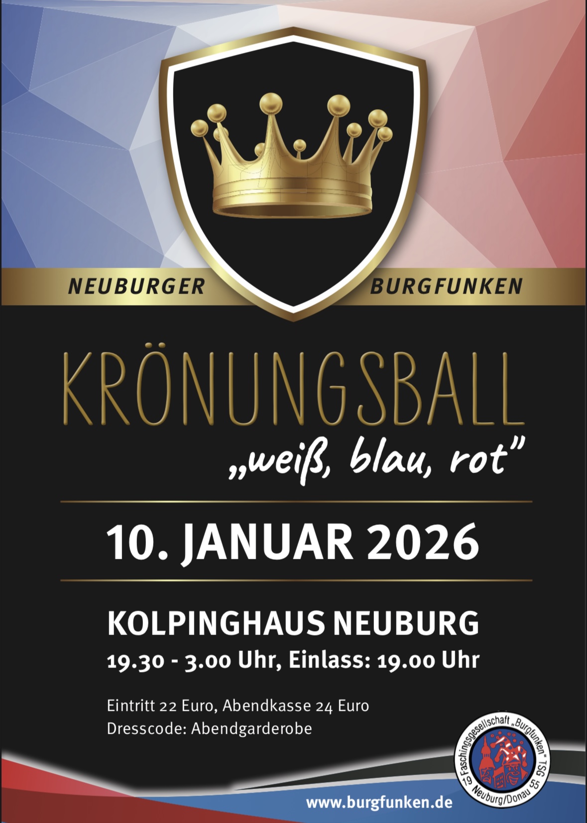 Änderungen an Veranstaltung einreichen NameBeschreibung<p>Krönungsball "weiß, blau, rot" der Neuburger Burgfunken. Einlass ist ab 19:00 Uhr.</p> <p><strong>Eintritt </strong>22,00 € | Abendkasse 24,00 €</p> <p><strong>Dresscode:</strong> Abendgarderobe</p> Bild Sie können hier Dateien ablegen Erlaubte Dateitypen: NameVorschauBeschreibungAlternativtextUrheberrechtLizenzDateigrößeTypZuletzt geändertKategorie2025-11-14_22-04-16-img_5001----310.06 kBBild14.11.2025, 22:04 - Hinzufügen Dateien Sie können hier Dateien ablegen Erlaubte Dateitypen: Hinzufügen Datum vonDatum bisFaschingsgesellschaft Burgfunken Neuburg TSG weiß/blau/rot e.V.Veranstalter(Bitte auswählen)Kolpinghaus NeuburgVeranstaltungsortFaschingFeste und FeiernPartyTanzballKategorienIhre AngabenNachnameVornameE-MailTelefonSofern die Veranstaltung abgesagt wird, tragen Sie hier bitte die Gründe dafür ein. Sofern es sich um einen neuen Veranstalter oder Veranstaltungsort handelt, tragen Sie hier bitte die Adresse und Kontaktdaten ein.Bei Absage der Veranstaltung: Grund der Absage. Bei neuem Veranstalter / Ort: Name, E-Mail und/oder Telefon, Webseite, Anschrift.Hiermit bestätige ich, dass ich die Rechte an den von mir hochgeladenen Bildern und Dateien besitze und diese auf der Veranstaltungsplattform und all ihren verknüpften Seiten dargestellt werden dürfen.CaptchaForename Eingaben absenden Abbrechen Informationen zur Verarbeitung Ihrer personenbezogenen Daten finden Sie in der Datenschutzerklärung. * Pflichtfeld Möchten Sie die Änderungen verwerfen?