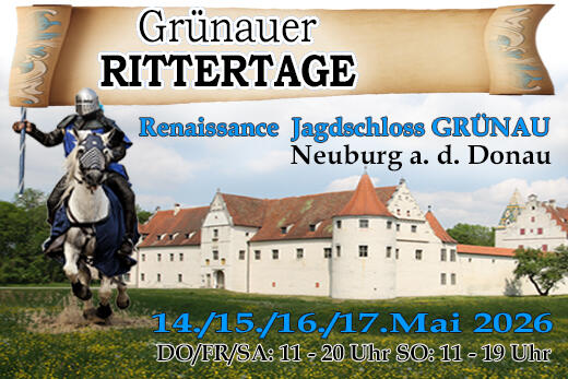 Änderungen an Veranstaltung einreichen NameBeschreibung<h4>Grünauer Rittertage</h4> <p style="text-align:justify">Seid gegrüßt, Ihr Fremden und Freunde! Mit allen Sinnen können große und kleine Besucher dieses einzigartige Jagd- und Renaissance Schloss erleben. Hier dreht sich alles um das Leben der Ritter und Landsknechte. Historisches Ambiente mit Spielen, Markt und Tanz. Handwerker aus den Ländereien demonstrieren Ihr Können und bieten ihre Waren feil. Speis & Trank mit Gauklern, Musikern. Kampfeslustige Rittersleute und Gäste können beim Bogenturnier und beim Schwertkampf ihre Kräfte messen. Einen weiteren Höhepunkt bieten "die Ritter der silbernen Rose", reitbegeisterte Zeitgenossen, die sich dem Darstellen der ritterlichen Exercitien mit ihren Pferden verschrieben haben! Abgerundet wird das Bild durch ihre Ausrüstung, Hufeisenwerfen und einem Kinderritterturnier. Kommt und verweilt ein wenig bei uns!</p> Bild Sie können hier Dateien ablegen Erlaubte Dateitypen: NameVorschauBeschreibungAlternativtextUrheberrechtLizenzDateigrößeTypZuletzt geändertKategorie2026-01-19_10-46-17-rt26----233.88 kBBild19.01.2026, 10:46 - Hinzufügen Dateien Sie können hier Dateien ablegen Erlaubte Dateitypen: Hinzufügen Datum vonDatum bisIM TEAM Event und Media GmbHVeranstalter(Bitte auswählen)Jagdschloss GrünauVeranstaltungsortMarktSonstigeKategorienIhre AngabenNachnameVornameE-MailTelefonSofern die Veranstaltung abgesagt wird, tragen Sie hier bitte die Gründe dafür ein. Sofern es sich um einen neuen Veranstalter oder Veranstaltungsort handelt, tragen Sie hier bitte die Adresse und Kontaktdaten ein.Bei Absage der Veranstaltung: Grund der Absage. Bei neuem Veranstalter / Ort: Name, E-Mail und/oder Telefon, Webseite, Anschrift.Hiermit bestätige ich, dass ich die Rechte an den von mir hochgeladenen Bildern und Dateien besitze und diese auf der Veranstaltungsplattform und all ihren verknüpften Seiten dargestellt werden dürfen.CaptchaForename Eingaben absenden Abbrechen Informationen zur Verarbeitung Ihrer personenbezogenen Daten finden Sie in der Datenschutzerklärung. * Pflichtfeld Möchten Sie die Änderungen verwerfen?