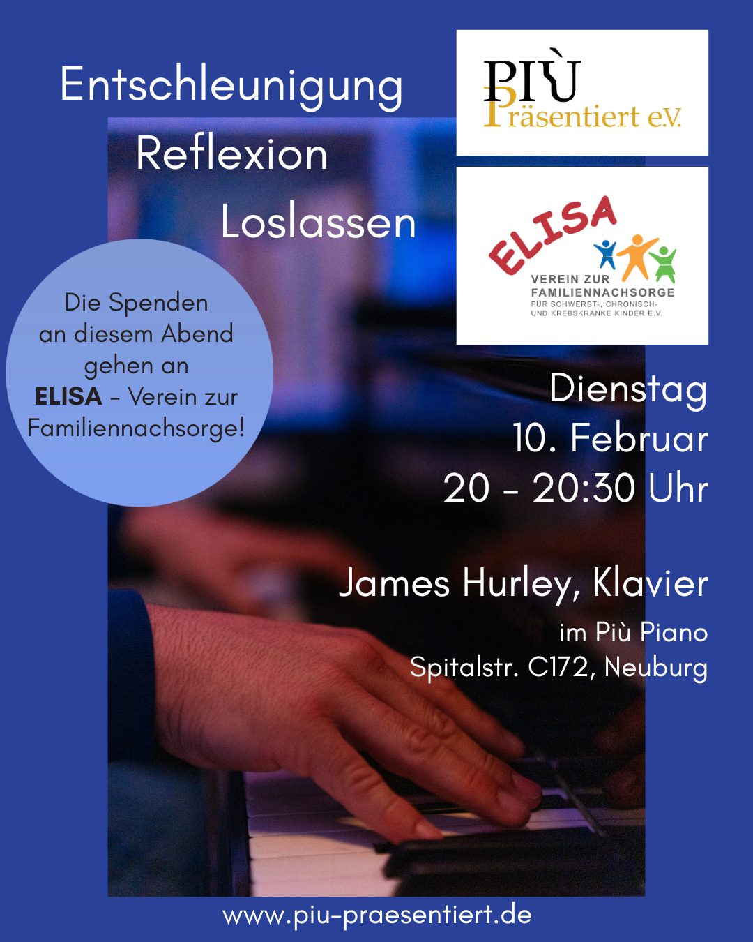 Änderungen an Veranstaltung einreichen NameBeschreibung<p>Nimm dir eine halbe Stunde Auszeit vom Lärm der Welt.</p> <p>Begleitet von Pianist James Hurleys ruhiger Klaviermusik.</p> <p>Eintritt frei! Die Spenden an diesem Abend gehen an ELISA - Verein zur Familiennachsorge!</p> <p>www.piu-praesentiert.de</p> <p>https://www.elisa-familiennachsorge.de</p> Bild Sie können hier Dateien ablegen Erlaubte Dateitypen: NameVorschauBeschreibungAlternativtextUrheberrechtLizenzDateigrößeTypZuletzt geändertKategorie2026-01-30_10-31-47-tuesday_night_elisa----1.16 MBBild30.01.2026, 10:31 - Hinzufügen Dateien Sie können hier Dateien ablegen Erlaubte Dateitypen: Hinzufügen Datum vonDatum bisPiù Präsentiert e. V.Veranstalter(Bitte auswählen)Più PianoVeranstaltungsortKonzertGesundheit und WellnessKategorienIhre AngabenNachnameVornameE-MailTelefonSofern die Veranstaltung abgesagt wird, tragen Sie hier bitte die Gründe dafür ein. Sofern es sich um einen neuen Veranstalter oder Veranstaltungsort handelt, tragen Sie hier bitte die Adresse und Kontaktdaten ein.Bei Absage der Veranstaltung: Grund der Absage. Bei neuem Veranstalter / Ort: Name, E-Mail und/oder Telefon, Webseite, Anschrift.Hiermit bestätige ich, dass ich die Rechte an den von mir hochgeladenen Bildern und Dateien besitze und diese auf der Veranstaltungsplattform und all ihren verknüpften Seiten dargestellt werden dürfen.CaptchaForename Eingaben absenden Abbrechen Informationen zur Verarbeitung Ihrer personenbezogenen Daten finden Sie in der Datenschutzerklärung. * Pflichtfeld Möchten Sie die Änderungen verwerfen?