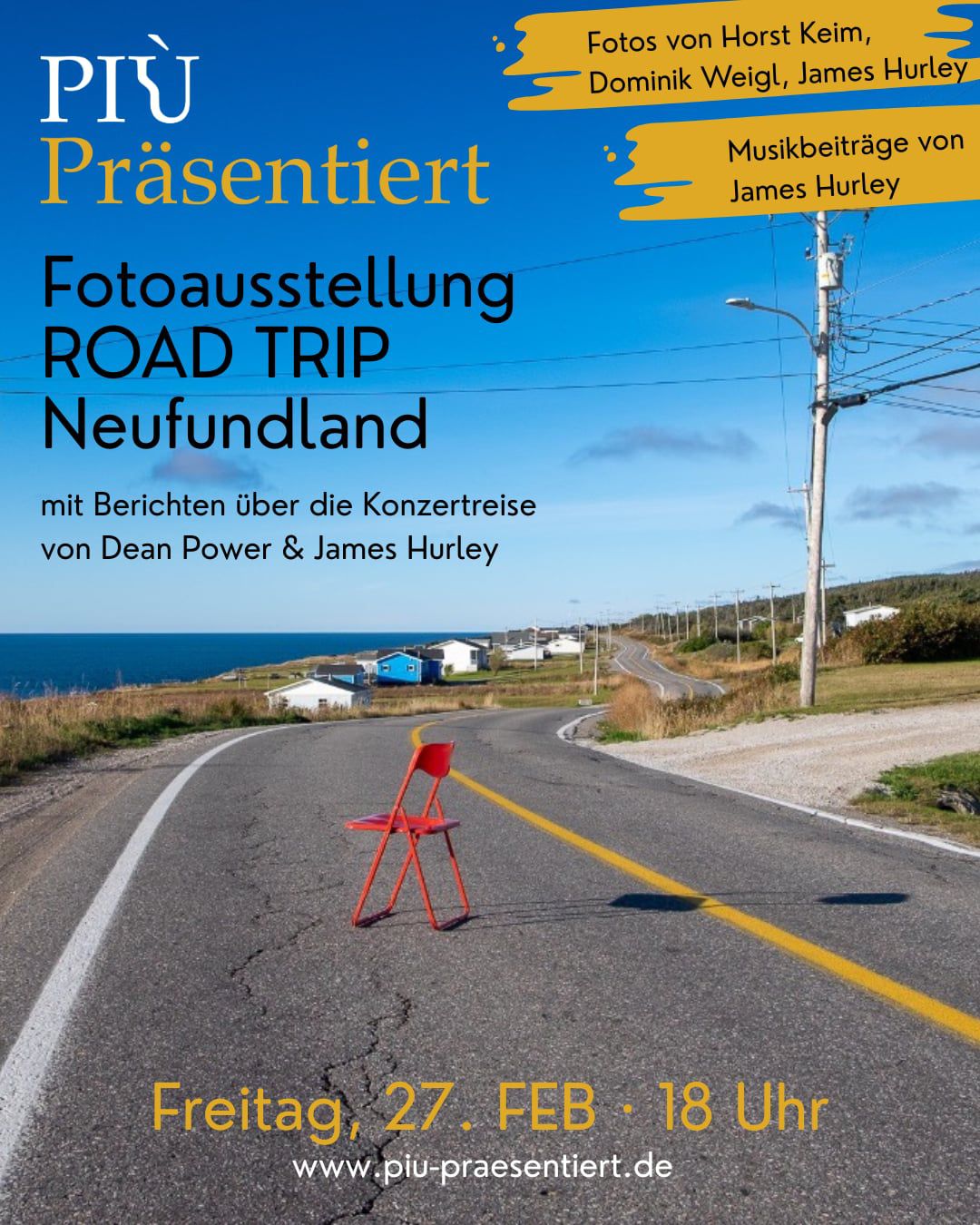 Änderungen an Veranstaltung einreichen NameBeschreibung<p style="text-align:justify">Die Ausstellung zeigt eindrucksvolle Momentaufnahmen einer besonderen Reise durch Neufundland. Gezeigt werden Fotografien von <strong>Horst Keim, Dominik Weigl und James Hurley</strong> von ihrer gemeinsamen Reise an diesen magischen Ort im Herbst 2025. Anlass dafür war die Konzerttournee von Dean Power und James. Berichte und Fotos geben Einblicke in das Leben <em>on the road</em> – zwischen Musik, Menschen und Orten. Musikalische Beiträge von James<strong> </strong>begleiten den Abend und schaffen eine atmosphärische Verbindung zwischen Bild, Klang und Geschichte.</p> <p>Eintritt frei!</p> <p>www.piu-praesentiert.de</p> Bild Sie können hier Dateien ablegen Erlaubte Dateitypen: NameVorschauBeschreibungAlternativtextUrheberrechtLizenzDateigrößeTypZuletzt geändertKategorie2026-02-05_08-39-59-644ab359-574b-498f-bac2-39dfc418c499----244.26 kBBild05.02.2026, 08:39 - Hinzufügen Dateien Sie können hier Dateien ablegen Erlaubte Dateitypen: Hinzufügen Datum vonDatum bisPiù Präsentiert e. V.Veranstalter(Bitte auswählen)Più PianoVeranstaltungsortAusstellungKonzertKategorienIhre AngabenNachnameVornameE-MailTelefonSofern die Veranstaltung abgesagt wird, tragen Sie hier bitte die Gründe dafür ein. Sofern es sich um einen neuen Veranstalter oder Veranstaltungsort handelt, tragen Sie hier bitte die Adresse und Kontaktdaten ein.Bei Absage der Veranstaltung: Grund der Absage. Bei neuem Veranstalter / Ort: Name, E-Mail und/oder Telefon, Webseite, Anschrift.Hiermit bestätige ich, dass ich die Rechte an den von mir hochgeladenen Bildern und Dateien besitze und diese auf der Veranstaltungsplattform und all ihren verknüpften Seiten dargestellt werden dürfen.CaptchaForename Eingaben absenden Abbrechen Informationen zur Verarbeitung Ihrer personenbezogenen Daten finden Sie in der Datenschutzerklärung. * Pflichtfeld Möchten Sie die Änderungen verwerfen?