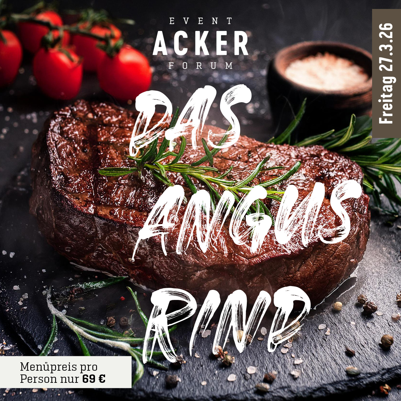 Änderungen an Veranstaltung einreichen NameBeschreibung<p><strong>Regional. Artgerecht. Unvergesslich.</strong></p> <p>Ein Abend ganz im Zeichen des Angus-Rinds: Verschiedene Cuts,</p> <p>perfekt zubereitet und begleitet von regionalen Beilagen. Angus-</p> <p>Züchter geben Einblicke in Haltung, Fütterung und die Besonderheiten dieser edlen Rasse. <strong>Echt. Informativ. Genussvoll.</strong></p> <p>Folgende Bestandteile sind im Preis inbegriffen:</p> <ul> <li><strong>Aperitif</strong></li> <li><strong>Gruß aus der Küche </strong></li> <li><strong>1: Gang: </strong>Rind / Trüffel / Wasser / Sellerie / Karotte / Lauch</li> <li><strong>2. Gang: </strong>Rind / Kartoffel / Pastinake / Karotten / Beete / Meerrettich</li> <li><strong>3. Gang: </strong>Kirsch / Schokolade / Mehl / Salz / Karamell</li> </ul> <p>Menüpreis pro Person nur <strong>69,00 €</strong></p> <p><strong>Tickets </strong>unter <u><a data-tabindex-counter="1" data-tabindex-value="none" href="https://www.dasacker.de/specials-termine/veranstaltungen.html" tabindex="-1">www.dasacker.de/specials-termine/veranstaltungen.html</a></u></p> Bild Sie können hier Dateien ablegen Erlaubte Dateitypen: NameVorschauBeschreibungAlternativtextUrheberrechtLizenzDateigrößeTypZuletzt geändertKategorie2026-02-16_14-53-46-event_vorschau_2026_quadrat8----826.87 kBBild16.02.2026, 14:53 - Hinzufügen Dateien Sie können hier Dateien ablegen Erlaubte Dateitypen: Hinzufügen Datum vonDatum bisDas ACKER Event ForumDie Acker AlmVeranstalter(Bitte auswählen)Die Acker AlmVeranstaltungsortKulinarische VeranstaltungKategorienIhre AngabenNachnameVornameE-MailTelefonSofern die Veranstaltung abgesagt wird, tragen Sie hier bitte die Gründe dafür ein. Sofern es sich um einen neuen Veranstalter oder Veranstaltungsort handelt, tragen Sie hier bitte die Adresse und Kontaktdaten ein.Bei Absage der Veranstaltung: Grund der Absage. Bei neuem Veranstalter / Ort: Name, E-Mail und/oder Telefon, Webseite, Anschrift.Hiermit bestätige ich, dass ich die Rechte an den von mir hochgeladenen Bildern und Dateien besitze und diese auf der Veranstaltungsplattform und all ihren verknüpften Seiten dargestellt werden dürfen.CaptchaForename Eingaben absenden Abbrechen Informationen zur Verarbeitung Ihrer personenbezogenen Daten finden Sie in der Datenschutzerklärung. * Pflichtfeld Möchten Sie die Änderungen verwerfen?
