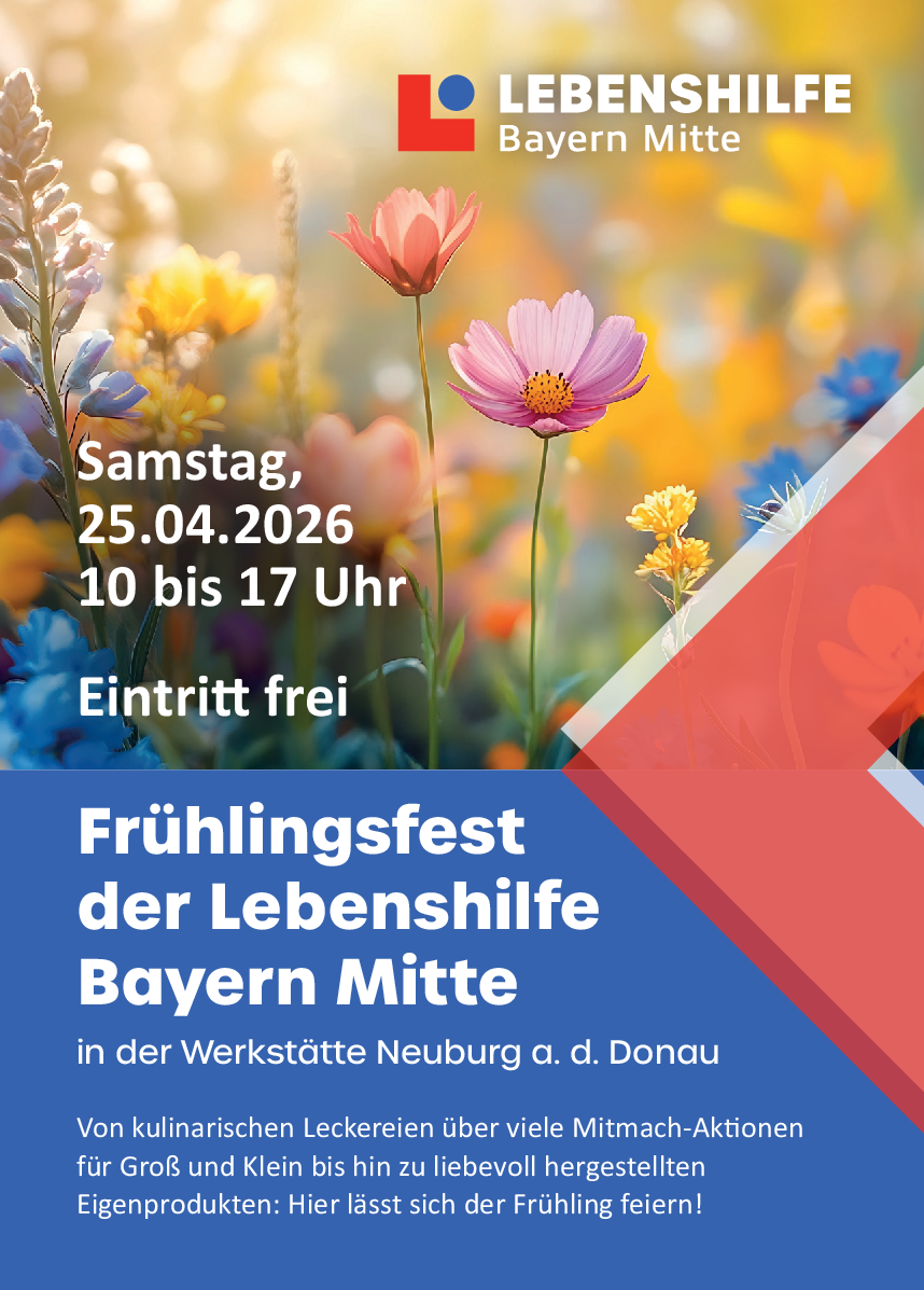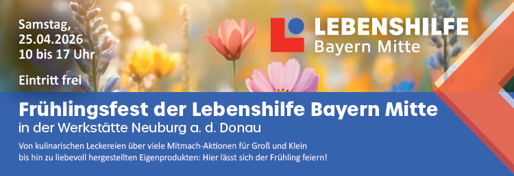 Änderungen an Veranstaltung einreichen NameBeschreibung<p style="text-align:justify">Der Frühling wird gefeiert – und zwar bei der Lebenshilfe Bayern Mitte. Beim jährlichen <strong>Frühlingsfest in der Werkstätte in Neuburg an der Donau</strong> erwarten die Besucherinnen und Besucher kulinarische Leckereien, viele Mitmach-Aktionen für Groß und Klein bis hin zu liebevoll hergestellten Eigenprodukten. Das FLORANUM, der Grünbereich der Lebenshilfe, wird ebenfalls mit einem Pflanzenverkauf mit dabei sein. Von <strong>10 bis 17 Uhr </strong>öffnet die Werkstätte am <strong>25. April 2026 </strong>ihre Türen und zeigt allen Interessierten, was die Lebenshilfe an ihrem Standort in der Nördlichen Grünauer Straße 38 in Neuburg zu bieten hat. Der Eintritt ist frei.</p> <p style="text-align:justify"><u><strong>Neu: Kinder-Specials!</strong></u></p> <p style="text-align:justify">• Teste <strong>Hobby Horsing</strong> bei einem großen Hindernislauf mit tollen Hobby Horses!<br /> • Bemale eine <strong>Tasche </strong>mit bunten Bildern!<br /> • Stelle deine <strong>eigene Kerze</strong> her!<br /> • Bestehe eine <strong>Werkstatt-Rallye</strong> und hol dir einen Gewinn!</p> Bild Sie können hier Dateien ablegen Erlaubte Dateitypen: NameVorschauBeschreibungAlternativtextUrheberrechtLizenzDateigrößeTypZuletzt geändertKategorie2026-04-07_14-04-22-banner----177.23 kBBild07.04.2026, 14:04 - Weiteres Element hinzufügen Hochladen Dateien Sie können hier Dateien ablegen Erlaubte Dateitypen: NameVorschauBeschreibungAlternativtextUrheberrechtLizenzDateigrößeTypZuletzt geändertKategorie2026-04-07_14-04-22-flyer_fruehlingsfest_2026.pdf----522.47 kBDokument07.04.2026, 14:04 - Weiteres Element hinzufügen Hochladen Datum vonDatum bisLebenshilfe Werkstätte NeuburgVeranstalter(Bitte auswählen)Lebenshilfe Werkstätte NeuburgVeranstaltungsortFeste und FeiernKategorienIhre AngabenNachnameVornameE-MailTelefonSofern die Veranstaltung abgesagt wird, tragen Sie hier bitte die Gründe dafür ein. Sofern es sich um einen neuen Veranstalter oder Veranstaltungsort handelt, tragen Sie hier bitte die Adresse und Kontaktdaten ein.Bei Absage der Veranstaltung: Grund der Absage. Bei neuem Veranstalter / Ort: Name, E-Mail und/oder Telefon, Webseite, Anschrift.Hiermit bestätige ich, dass ich die Rechte an den von mir hochgeladenen Bildern und Dateien besitze und diese auf der Veranstaltungsplattform und all ihren verknüpften Seiten dargestellt werden dürfen.CaptchaForename Eingaben absenden Abbrechen Informationen zur Verarbeitung Ihrer personenbezogenen Daten finden Sie in der Datenschutzerklärung. * Pflichtfeld Möchten Sie die Änderungen verwerfen?